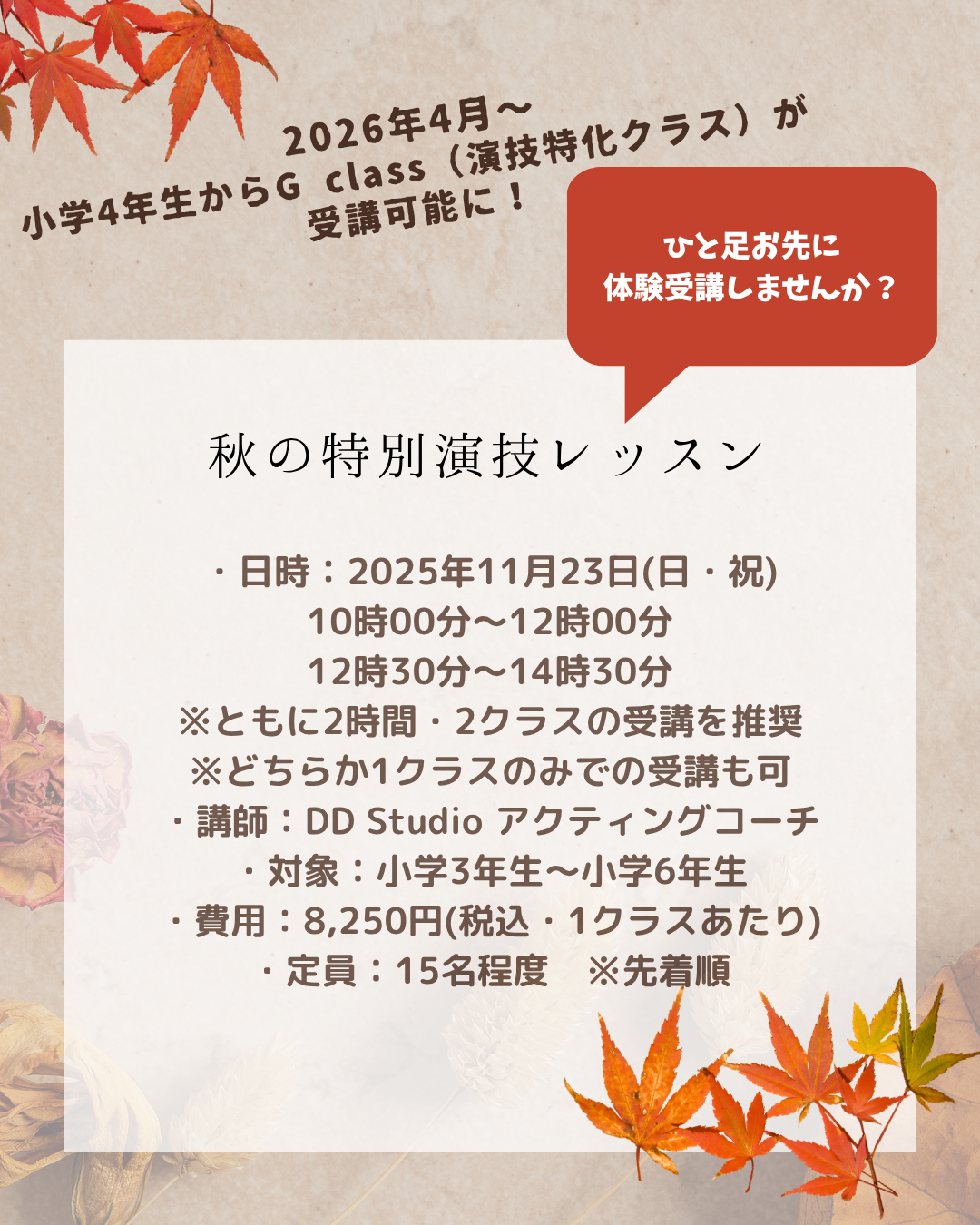 ホリプロスタースタジオからお知らせです。 2026年4月より、G class(演技特化クラス)が小学4年生より受講可能となります。現中学生以上→小学校4年生(高学年相当)以上 へ、受講年齢が引き下げとなります。理由として […]